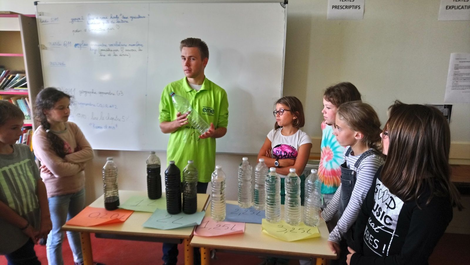 Nous avons découvert toutes les étapes de la "vie" d'une bouteille en plastique (conception, fabrication, utilisation, recyclage) et appris comment réduire au maximum l'impact négatif du plastique sur l'environnement (diminuer l'épaisseur du plastique de la bouteille, la réutiliser, la recycler, fabriquer des bouteilles carrées pour optimiser l'espace lors du transport).